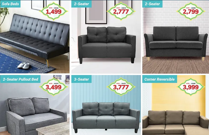 އެއް އަހަރުގެ ވޮރެންޓީއާ އެކު ސޯފާގެ އަގުތައް މި ސޭލްގައި އުޅެނީ 1،499ރ. އިން ފެށިގެން 8،000ރ. އާ ދެމެދުގެ އަގުތަކެއްގަ އެވެ.