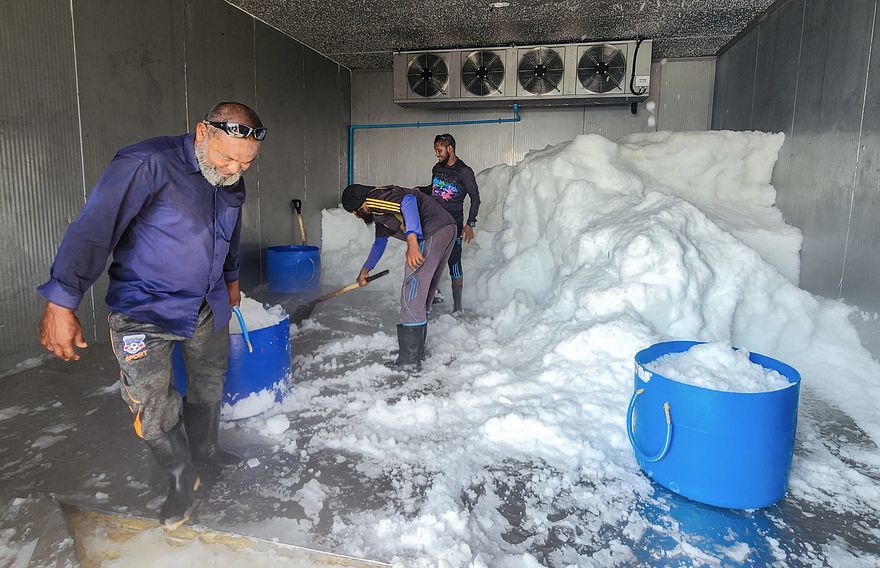 ފިޝަރީޒް މިނިސްޓްރީން މިދިޔަ އޭޕްރީލް މަހު ބުނެފައިވާ ގޮތުގައި 11 ރަށެއްގައި އައިސް ޕްލާންޓް ހެދުމުގެ މަސައްކަތް އަންނަނީ ކުރަމުންނެވެ. އެ މަސައްކަތް ވެސް ކުރަނީ ސައުދީ ފަންޑުގެ އެހީގެ ދަށުންނެވެ.