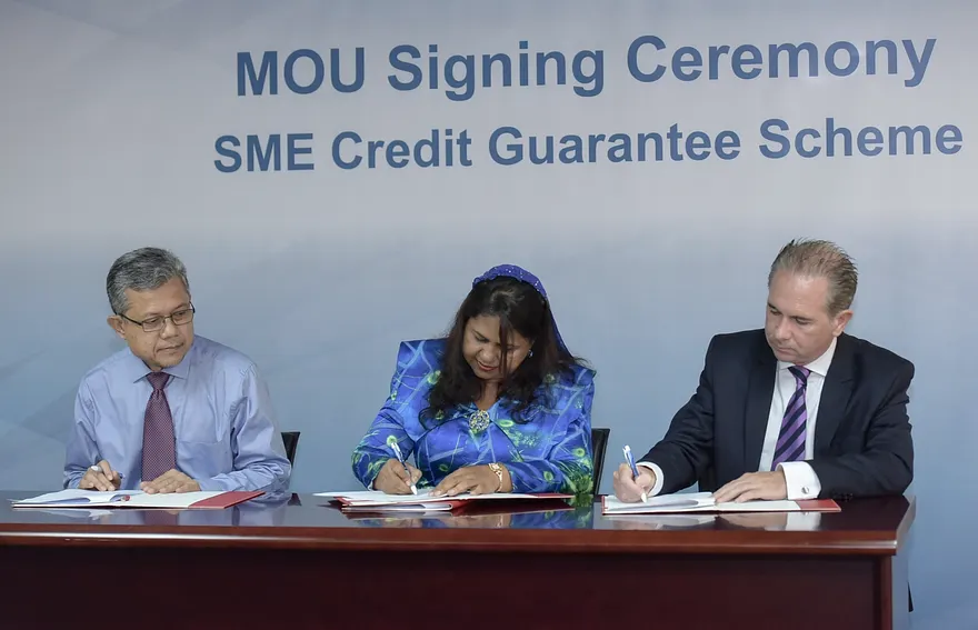 މަރުކަޒީ ބޭންކުގައި ބޭއްވި ރަސްމިއްޔާތެއްގައި ކްރެޑިޓް ގެރެންޓީ ސްކީމްގައި ބައިވެރިވުމުގެ އެއްބަސްވުމުގައި އެމްއެމްއޭގެ ފަރާތުން ސޮއިކުރެއްވީ ގަވަރުނަރު ޑރ. އަޒީމާ އާދަމް އެވެ. ބީއެމްއެލްގެ ފަރާތުން ސޮއިކުރެއްވީ ސީއީއޯ އެންޑްރޫ ހީލީ އެވެ. އެމްއައިބީގެ ފަރާތުން ސޮއިކުރެއްވީ މެނޭޖިން ޑިރެކްޓަރު ހަރީސް ހާރޫން އެވެ.