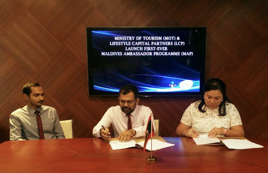 މޯލްޑިވްސް އެމްބެސެޑަރު ޕްރޮގްރާމް ފެށުމަށް އެކަމާ ބެހޭ އެއްބަސްވުމެއްގައި ޓޫރިޒަމް މިނިސްޓްރީ އާއި ހޮން ކޮންގުގެ ކުންފުންޏެއް ކަމަށްވާ ލައިފްސްޓައިލް ކެޕިޓަލް ޕާޓްނާސް (އެލްސީޕީ)އާ އެކު މިއަދު ވަނީ ސޮއިކޮށްފަ އެވެ. ޓޫރިޒަމް މިނިސްޓްރީގައި ބޭއްވި ރަސްމިއްޔާތެއްގައި މިނިސްޓަރު އެ އެއްބަސްވުމުގައި ސޮއިކުރެއްވީ މިނިސްޓަރު މޫސާ ޒަމީރާއި ލައިފްސްޓައިލް ކެޕިޓަލްގެ ވެރިޔާ ލިން ވިލަޑޮއިޑެވެ.