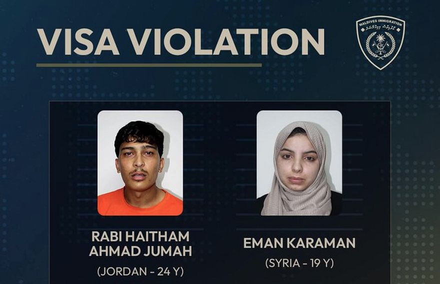 އިމިގްރޭޝަނުން ހިފަހައްޓާފައި ވަނީ ސީރިއާގެ 19 އަހަރުގެ އަންހެނަކާއި ޖޯޑަންގެ 24 އަހަރުގެ ފިރިހެނެކެވެ. އެ މީހުން ރާއްޖެ އައި ދުވަހެއް އިމިގްރޭޝަނުން އަދި ނުބުނެ އެވެ.