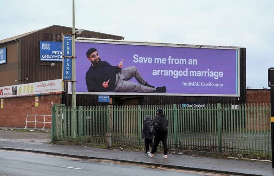 ބާމިންހަމްގައި ބަހައްޓާފައިވާ ބިޔަ ބިލްބޯޑެއްގައި މުހައްމަދު މާލިކް ކިޔާ 29 އަހަރުގެ މީހާ އިންނާނެ މީހަކު ހޯދަން ކުރި އިޝްތިހާރު ގެނެސްދީފައި އިނީ "ސޭވް މީ ފްރޮމް އޭން އެރޭންޖްޑް މެރިޖް" ޖަހައިފަ އެވެ. އަދިި އޭގެ ތިރީގައި އޭނަގެ ވެބްސައިޓް "ފައިންޑްމާލިކްއަވައިފް.ކޮމް" ޖަހަފައިވެ އެވެ. ވެބްސައިޓްގައިވާ ގޮތުން މާލިކް އަކީ އަމިއްލަ މަސައްކަތްކުރާ ވިޔަފާވެރިއެކެވެ. އަދި ބޭނުން ވަނީ ދީންވެރި އަންހެނެކެވެ.