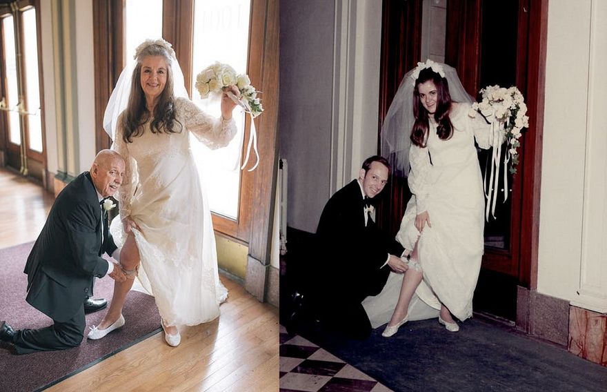 ކައިވެންޏަށް 50 އަހަރު ފުރުން ފާހަގަކުރަން އެމެރިކާގެ ދުވަސްވީ ދެމަފިރިއަކު އެ މީހުންގެ ކައިވެނީގެ ހެދުމުގައި އެންމެ ފުރަތަމަ ދުވަހު ނެގި ގޮތަށް ޕޯޒްކޮށް، ފޮޓޯތައް އާކޮށްފި އެވެ.