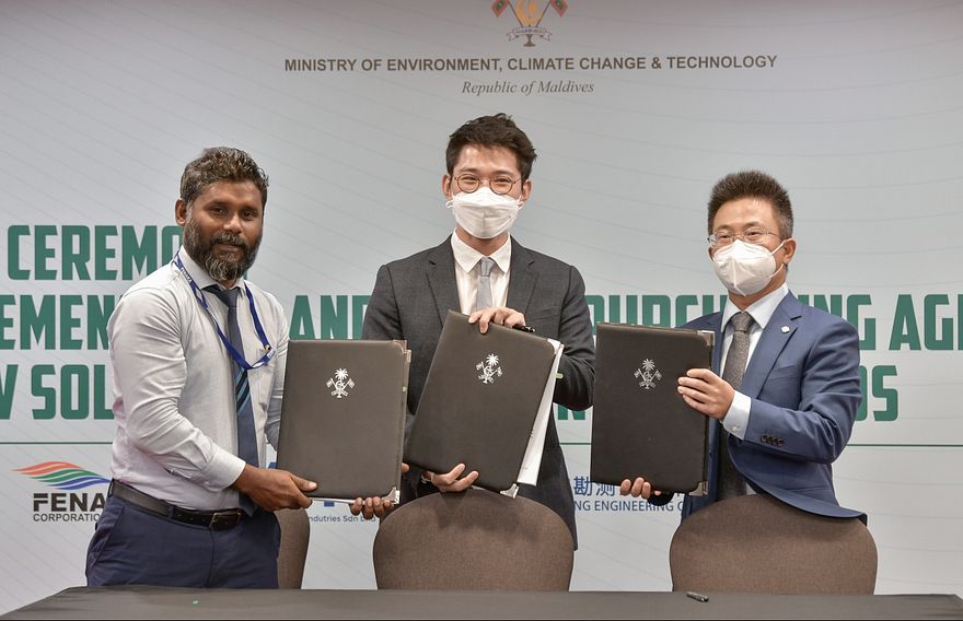 އެންވަޔަރަމަންޓް މިނިސްޓްރީގެ ފަރާތުން އެ އެއްބަސްވުންތަކުގައި ސޮއިކުރެއްވީ، ދުބާއީގައި ހުންނަވައި ވާޗުއަލްކޮށް ރަސްމިއްޔާތުގައި ބައިވެރިވެވަޑައިގެންނެވި މިނިސްޓަރު އައިމިނަތު ޝައުނާ އެވެ. މެގަ ފަސްޓްގެ ފަރާތުން ސޮއިކުރެއްވީ އެ ކުންފުނީގެ ހެޑް އޮފް ރިނިއުވަބަލްސް ޑިވިޝަން، ޗިން ސަން އެވެ. އަދި ޖޮއިންޓް ވެންޗާގައި ހިމެނޭ ޕަވަ ޗައިނާ ކޯޕަރޭޝަންގެ ފަރާތުން ސޮއިކުރެއްވީ އެ ކުންފުނީގެ ޖެނެރަލް މެނޭޖަރު ސޮންގް ކިން ގޯ އެވެ.