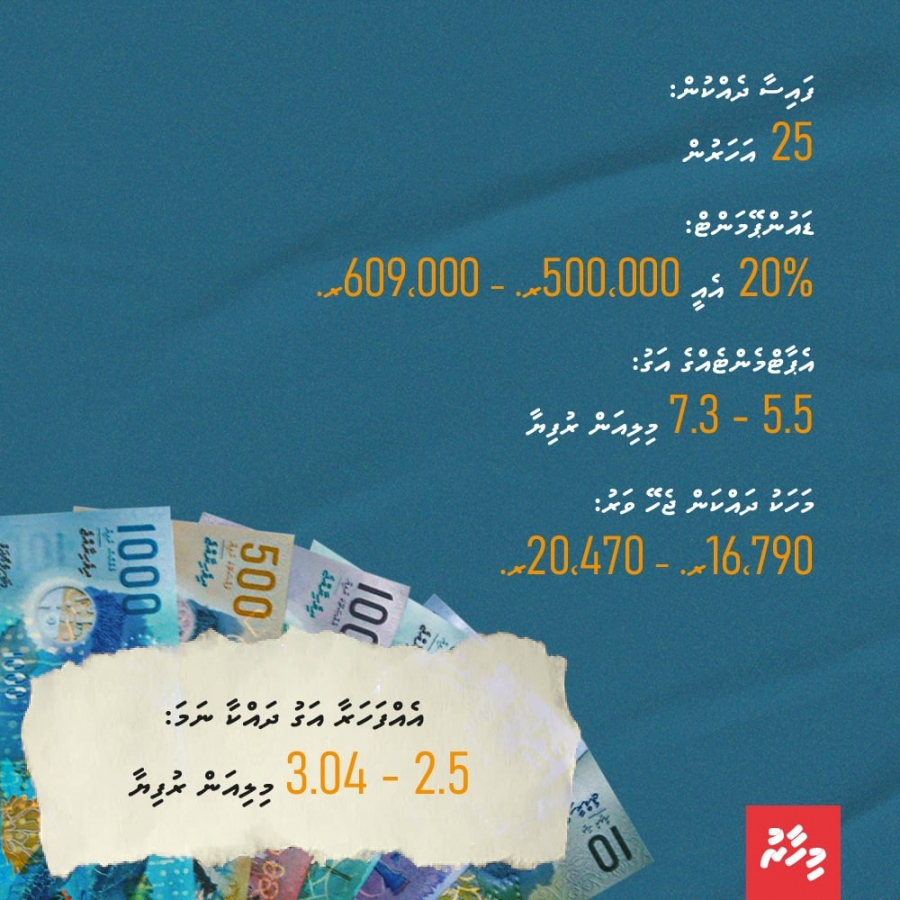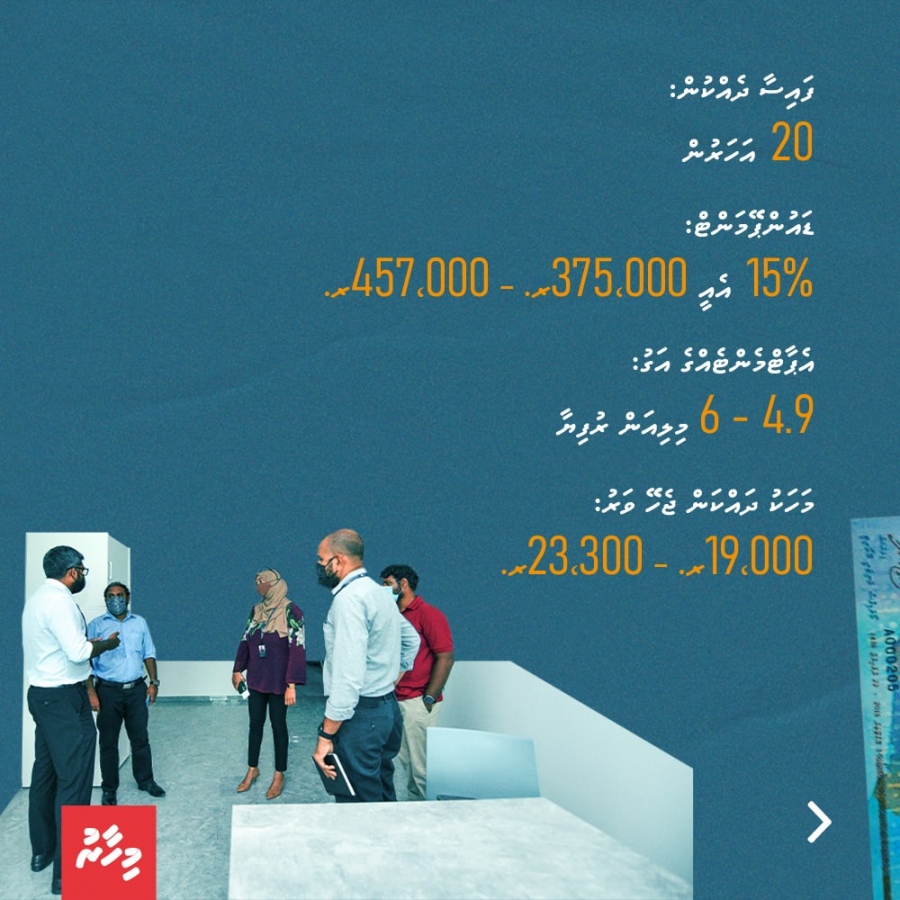 ގާތްގަނޑަކަށް 800-900 އަކަފޫޓު ބޮޑުމިނުގެ އެ ފްލެޓްތައް ތަފާތު ދެ ގޮތަކަށް ގަތުމުގެ ފުރުސަތު އެބައޮތެވެ. އެއް އޮޕްޝަނަކީ ފްލެޓްގެ އަގުގެ 15 ޕަސެންޓް ޑައުންޕޭމެންޓްގެ ގޮތުގައި ދައްކައިގެން 20 އަހަރުގެ ތެރޭގައި ތަނުގެ އަގު އަދާކުރުމެވެ. ދެވަނަ އޮޕްޝަނަކީ 20 ޕަސެންޓް ދައްކައިގެން އެޕާޓްމެންޓްގެ ކުލި 25 އަހަރަށް ބަހާލައިގެން ދެއްކުމެވެ.