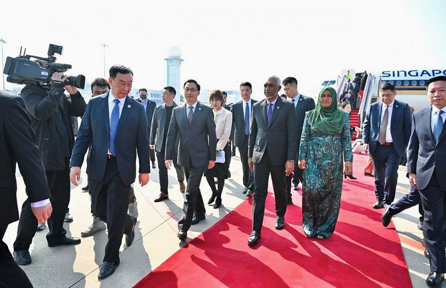 ޗައިނާގެ ރައީސް ޝީ ޖިންޕިންގެ ދައުވަތަކަށް ކުރައްވާ ފުރަމާނަ ދަތުރުފުޅެއްގައި ރައީސް ޑރ. މުހައްމަދު މުއިއްޒުގެ ދެކަނބަލުން މިއަދު ހެނދުނު އެ ގައުމަށް ވަޑައިގަތުމުން ރަތްދޫލައިގެ މަރުހަބާއެއް ކިޔައިފި އެވެ.