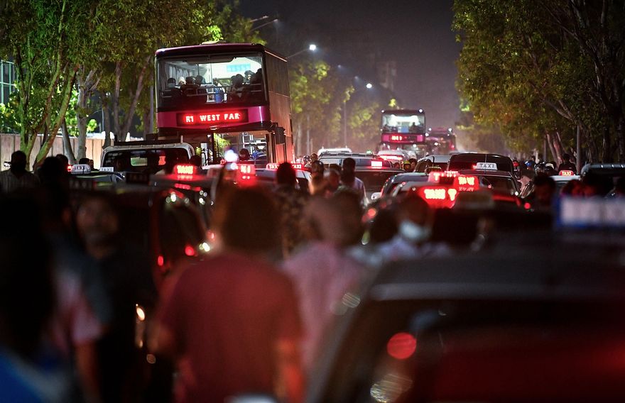 ޓެކްސީ ޑްރައިވަރުން އިހުތިޖާޖުކުރަމުން ދަނީ ހުޅުމާލެއިން ހައިވޭއަށް އަރަން އޮންނަ ހިސާބު ކައިރީގަ އެވެ.