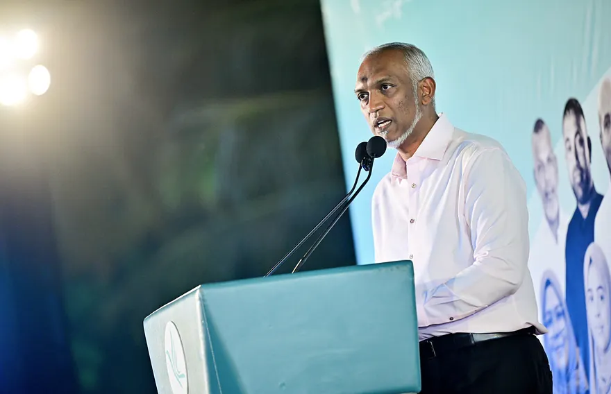 "ދަ ގްރޭޓާ އައްޑޫ" ތަސައްވުރު އިފްތިތާހުކުރުމަށް އާޓިފިޝަލް ބީޗުގައި ބޭއްވި ރަސްމިއްޔާތުގައި ރައީސް މުއިއްޒު ވާހަކަފުޅު ދައްކަވަނީ.-- ފޮޓޯ: މިހާރު