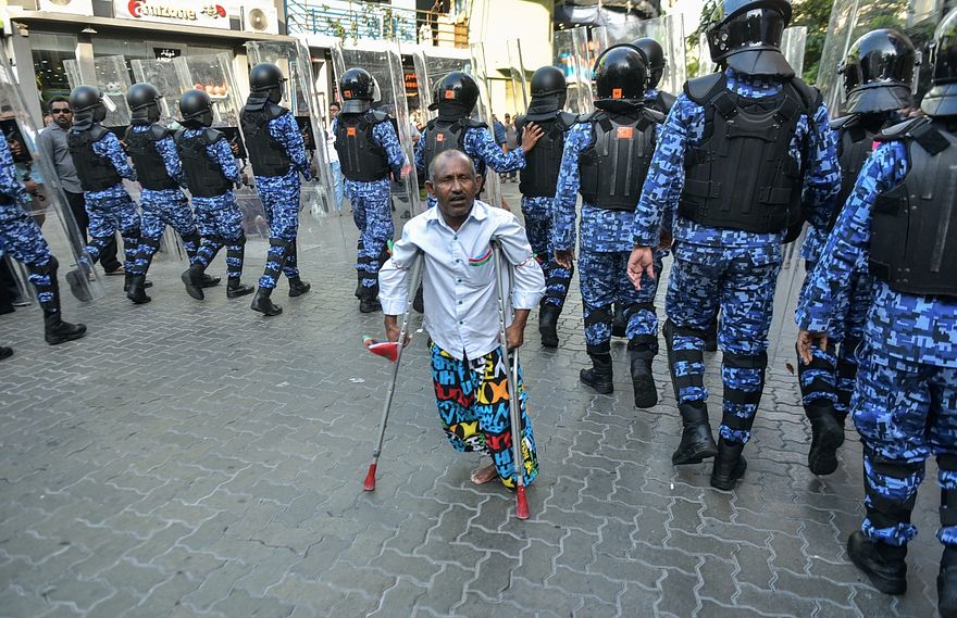 އެތައް ސަތޭކަ ބަޔަކު އެއްވެ ސަރުކާރާ ދެކޮޅަށް ޝުއޫރު ފާޅުކުރަމުން ދަނިކޮށް ފުލުހުން އައިސް އެއްވުމުގެ ބައިވެރިން ފަހަތަށް ޖެއްސުމުން ވެސް ސަރަހައްދު ދޫކޮށްނުދިޔަ އެކަކު ހުއްޓެވެ؛ ރައިޓް ގިޔަރުގައި ތިބި ފުލުހުންގެ ކުރިމަތީގައި ބަސްބުނަން ހުރީ ޖިސްމާނީ ނުކުޅެދުންތެރިކަން ހުރި އަބްދުއްރަޝީދު އިބްރާހިމް އެވެ.