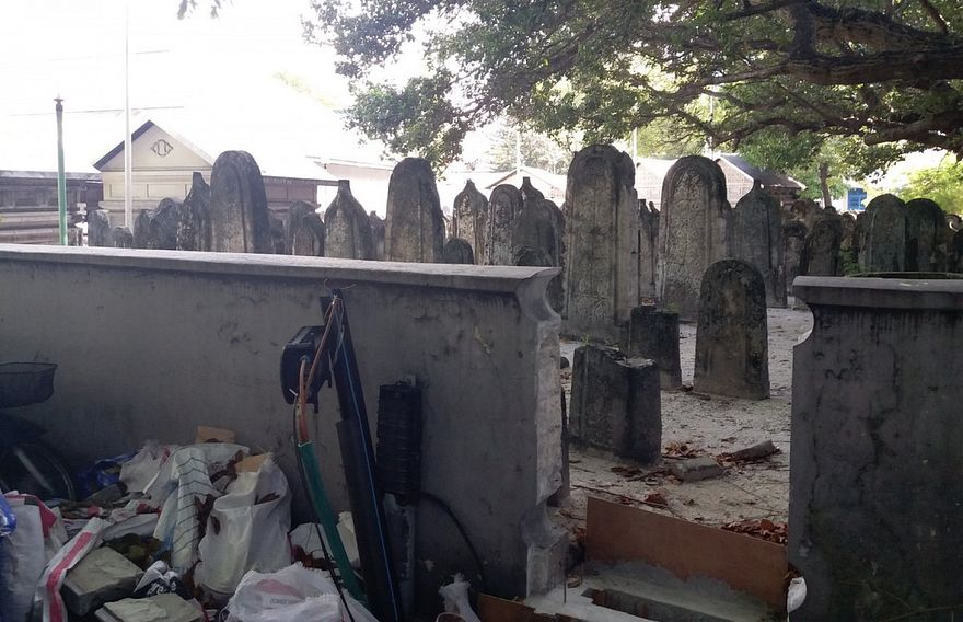ހުކުރު މިސްކިތު ގަބުރުސްތާން. އެ މިސްކިތުގެ ހަރިންމަ ފާރުން ބައެއް ވަނީ ތަޅާލާފައި