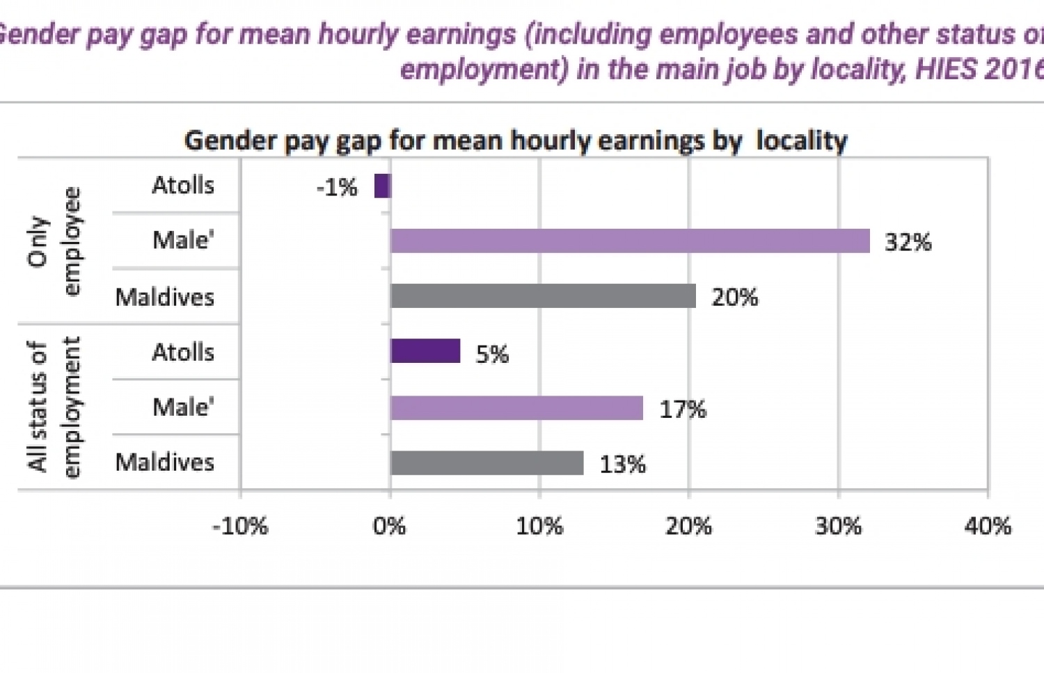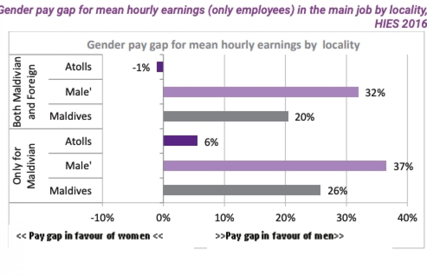 ނެޝަނަލް ބިއުރޯ އޮފް ސްޓެޓިސްޓިކްސް (އެންބީއެސް) އިން ހަޔަސްގެ މަސައްކަތްތެރިކަމާ ގުޅޭ ތަފާސްހިސާބު އެކުލަވާލައި ނެރެފައިވާ ރިޕޯޓުގައި ފާހަގަކޮށްފައިވާ ގޮތުގައި މުޅި ރާއްޖެ އަށް ބަލާ އިރު 2016 ވަނަ އަހަރު އަންހެން މުވައްޒަފުންގެ މުސާރަ ފިރިހެން މުވައްޒަފުންގެ މުސާރަ އަށް ވުރެ އެވްރެޖްކޮށް 20 ޕަސެންޓް ކުޑަ އެވެ. އަދި ހަމައެކަނި ދިވެހިންނަށް ބަލާ ނަމަ، އެ ފަރަގު (ޖެންޑަ ޕޭ ގެޕް) 26 ޕަސެންޓަށް އަރަ އެވެ.