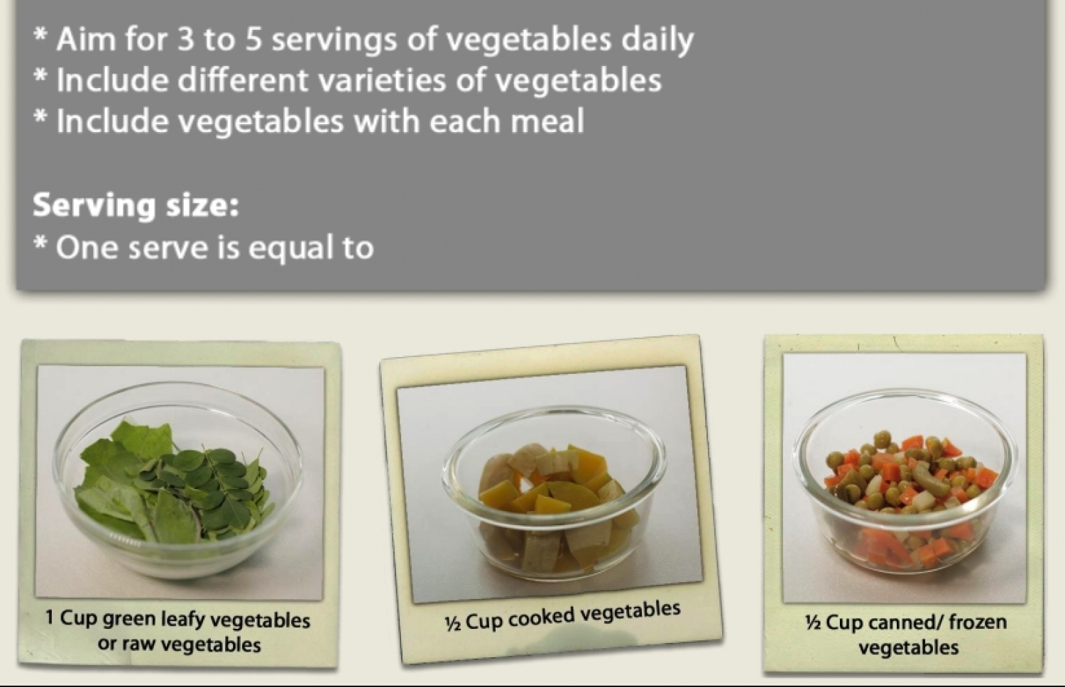 ގައިޑްލައިންގައި، ފަހަރަކު ކާން ޖެހޭ މިންވަރު (ސާވިން ސައިޒް) ކަނޑައަޅާފައި ވަނީ މެދު މިންވަރަކަށް ހަރަކާތްތެރިވެ އުޅޭ ބޮޑެތި މީހުންނަށް އެކަށީގެންވާ ވަރަށެވެ. ކުޑަކުދިންނާއި އުމުރުން ދުވަސްވީ މީހުން ކާން ޖެހެނީ އެއަށް ވުރެ މަދުންނެވެ. ބުރަ މަސައްކަތްތައް ކުރާ ފިރިހެނުންނާއި ފުރާވަރު ކުދިންނާއި މާބަނޑުމީހުންނާއި ގާތުން ކިރުދޭ މީހުންނަށް އެއަށް ވުރެ ގިނައިން ކާނާ ބޭނުންވާނެ ކަމަށާއި ހާއްސަ ޑައިޓްތައް ގެންގުޅެން ޖެހޭ މީހުން ޑައިޓީޝަނެއް ނުވަތަ ސިއްހީ މާހިރެއްގެ ލަފާ ހޯދަން ވާނެ ކަމަށް ގައިޑްލައިން ބުނެ އެވެ.