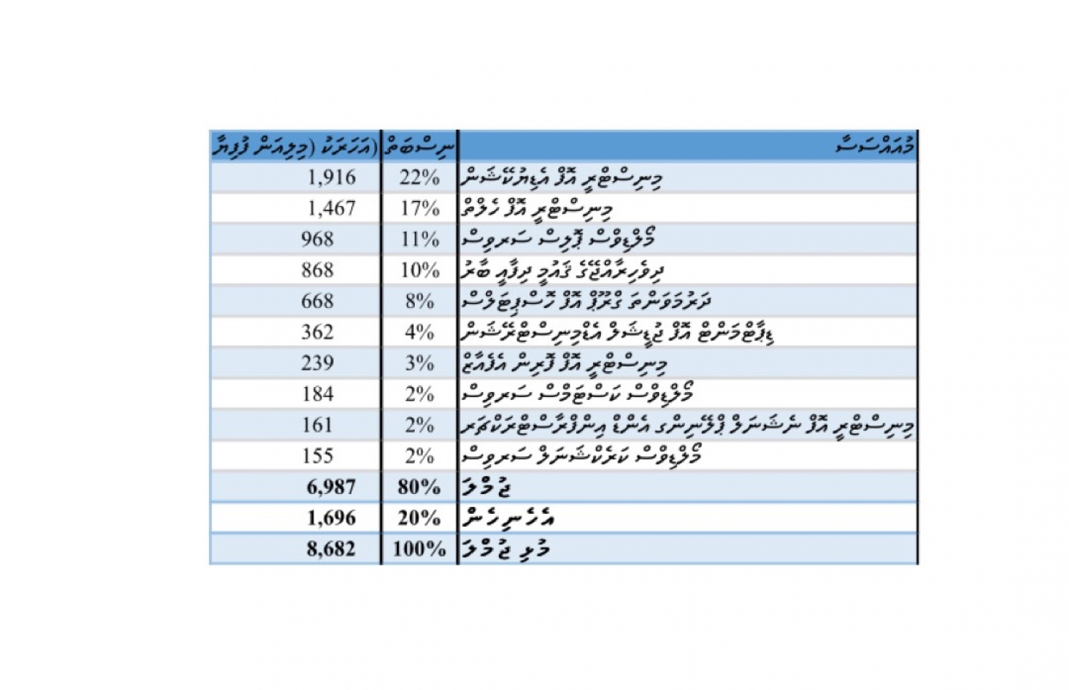 ދައުލަތުގެ މުސާރައިގެ 80 ޕަސެންޓް ނިސްބަތް ވަނީ، ދައުލަތުގެ 10 މުވައްސަސާއަކަށެވެ. އޭގެ ތެރެއިން، 22 ޕަސެންޓަކީ އެޑިޔުކޭޝަން މިނިސްޓްރީ އެވެ. ހެލްތް މިނިސްޓްރީ އަށް 17 ޕަސެންޓެވެ. ދެން އެއަށް ފަހު، ފުލުހުންނާއި ގައުމީ ދިފާއީ ބާރު ހިއްސާކުރަނީ، 21 ޕަސެންޓެވެ.