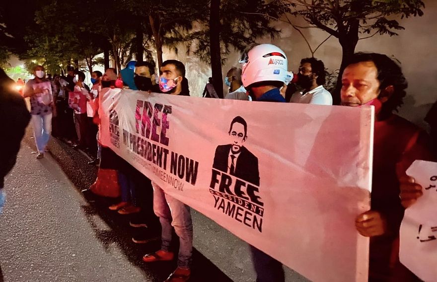 ކުރީގެ ރައީސް އަބްދުﷲ ޔާމީން މިނިވަންކުރަން ގޮވާލައި، ހޯމް މިނިސްޓަރު އިމްރާން އަބްދުﷲ ހުޅުމާލޭގައި ދިރިއުޅުއްވާ ފްލެޓް ކައިރީގައި އިދިކޮޅު ކޯލިޝަނުން މިރޭ މުޒާހަރާ ކޮށްފި އެވެ.