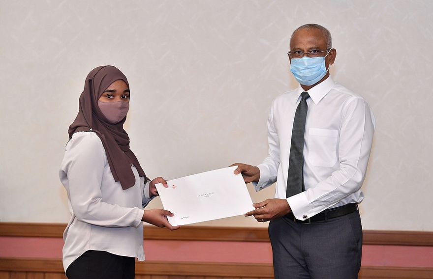 ރައީސް އޮފީހުގައި ބޭއްވި ރަސްމިއްޔާތުގައި، މިިދިޔަ މެއި/ޖޫން މަހު ބޭއްވި އިމްތިހާނުގައި، ފަސް މާއްދާ އިން އޭ ސްޓާ ނުވަތަ ޝަހާދާ ސާނަވީ އިމްތިހާނުގައި ހުރިހާ މާއްދާއަކުން އޭ ސްޓާ ހާސިލްކުރި ދަރިވަރުންނަށް، ސްކޮލަޝިޕްގެ ލިޔުން ހަވާލުކުރެއްވީ ރައީސް އިބްރާހިމް މުހައްމަދު ސޯލިހެވެ.