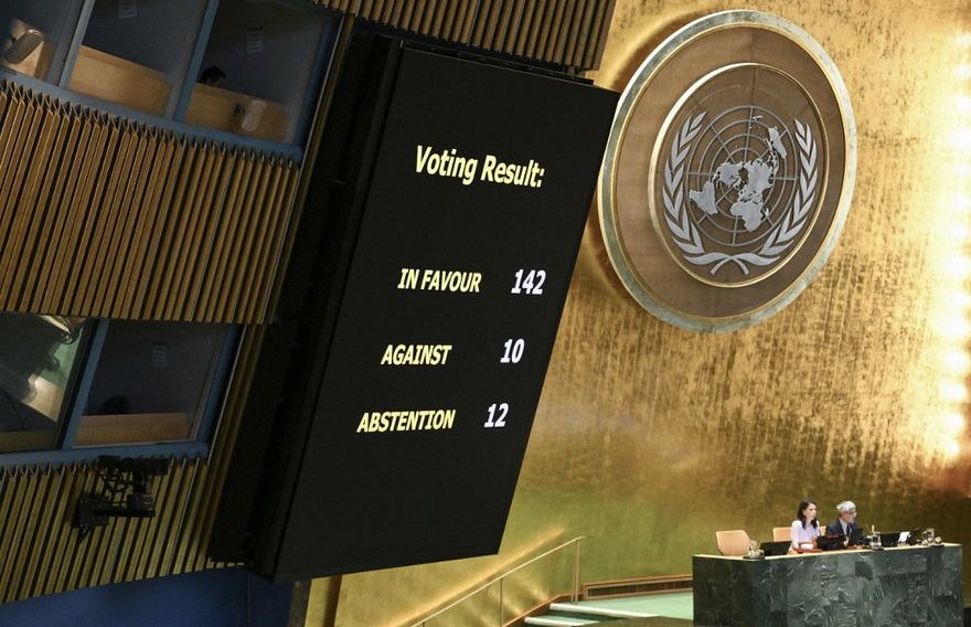 ހަމާސް އިން ޣައްޒާގެ ކޮންޓްރޯލް ދޫކޮށްލައި ފަލަސްތީން އޮތޯރިޓީއަށް ހަތިޔާރު ހަވާލުކުރުމަށް ގޮވާލާ މި ގަރާރަށް އދ.ގެ 193 މެންބަރު ގައުމުގެ ތެރެއިން 142 ގައުމަކުން ވަނީ ތާއީދުކޮށް ވޯޓު ދީފަ އެވެ. ދެކޮޅަށް 10 ވޯޓު ދީފައި ވާއިރު އޭގެ ތެރޭގައި އިޒްރޭލާއި އެމެރިކާ ހިމެނެ އެވެ. ވޯޓުގައި 12 ގައުމަކުން ބައިވެރިއެއް ނުވެ އެވެ.