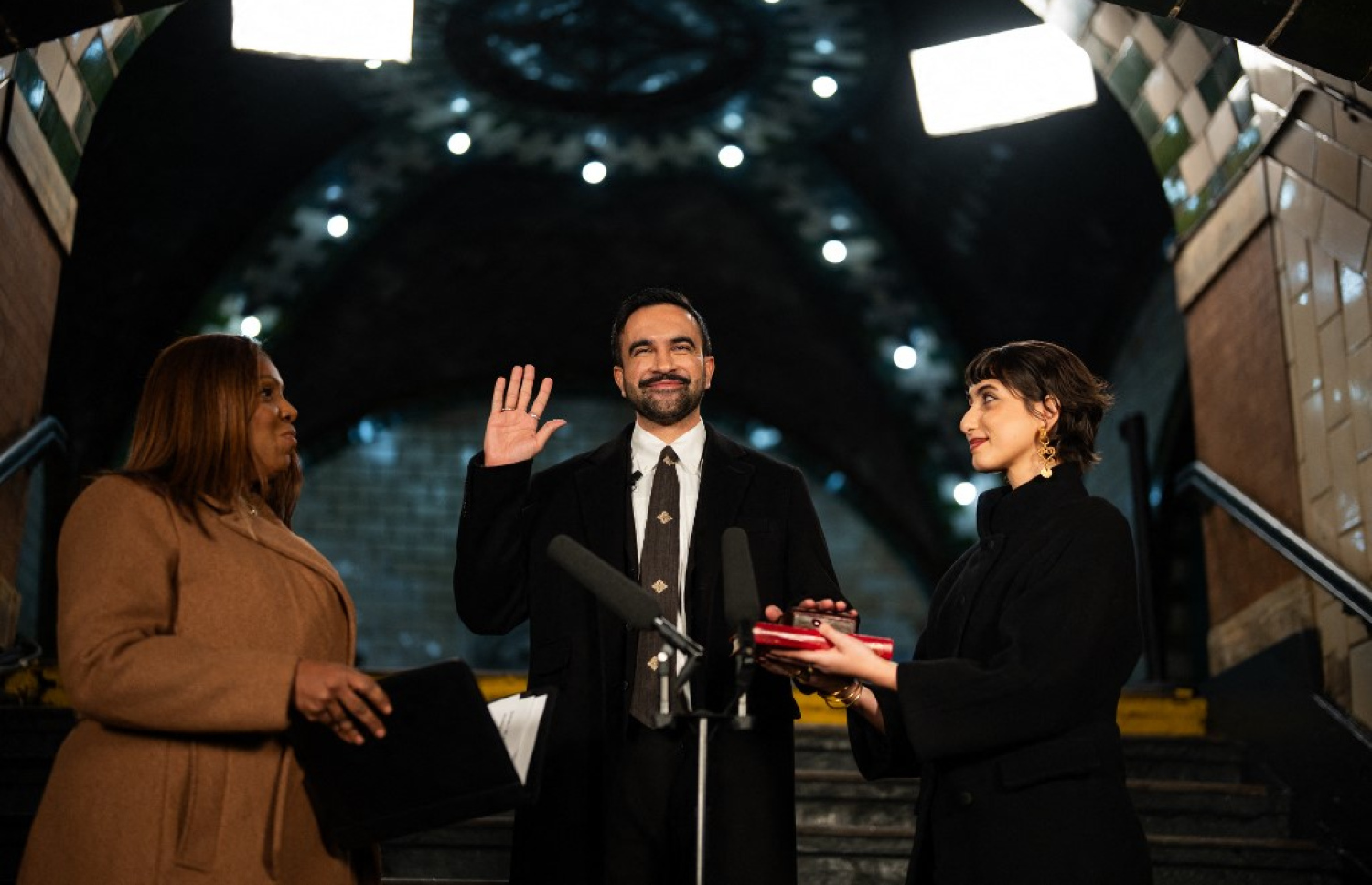 ނިއު ޔޯކަށް 2026 ވަނަ އަހަރު ފެށުނު ވަގުތު މަމްދާނީ މަގާމުގެ ހުވާކުރެއްވީ ސިޓީ ހޯލްގެ ދަށުގައި މިހާރު ބޭނުން ނުކޮށް ދޫކޮށްލާފައިވާ ސަބްވޭ ސްޓޮޕެއްގައި ބޭއްވި ރަސްމިއްޔާތެއްގަ އެވެ.