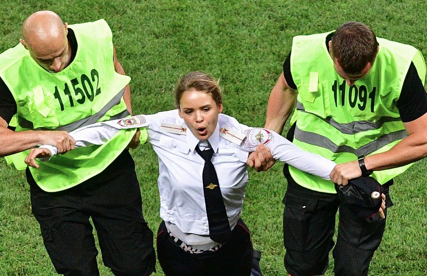 ރަޝިޔާގައި އިންސާނީ ހައްގުތަކާ ޚިލާފަށް ހިންގާ އަމަލުތަކާ ދެކޮޅަށް އަޑު އުފުލާ ޕުސީ ރަޔޮޓްސްގެ ހަތަރު މެންބަރުން ފްރާންސާއި ކްރޮއޭޝިއާ ކުޅުނު ވޯލްޑް ކަޕް ފައިނަލް މެޗުގެ 52 ވަނަ މިނިޓުގައި ދަނޑަށް އެރުމާ އެކު ސެކިއުރިޓީން އެ މީހުންގެ ފަހަތުން ގޮސް ހިފަހައްޓައި ދަނޑުން ބާލައިފަ އެވެ. އެ މީހުން ދަނޑަށް އެރުމުން 25 ސިކުންތަށް ކުޅުން ހުއްޓާލަން ޖެހުނެވެ.